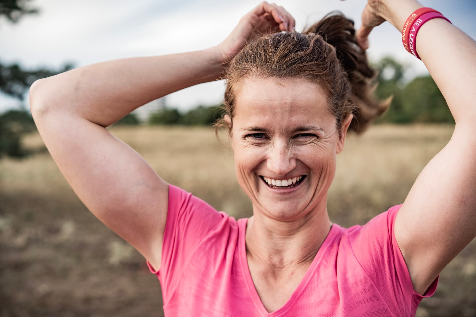 Eine Teilnehmerin dehnt ihre Schulter zur Vorbereitung auf das Training