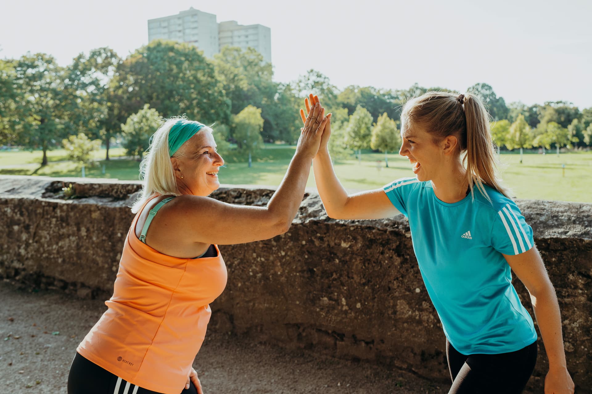 Zwei Personen motivieren sich gegenseitig zwischen zwei Übungen mit einem Highfive