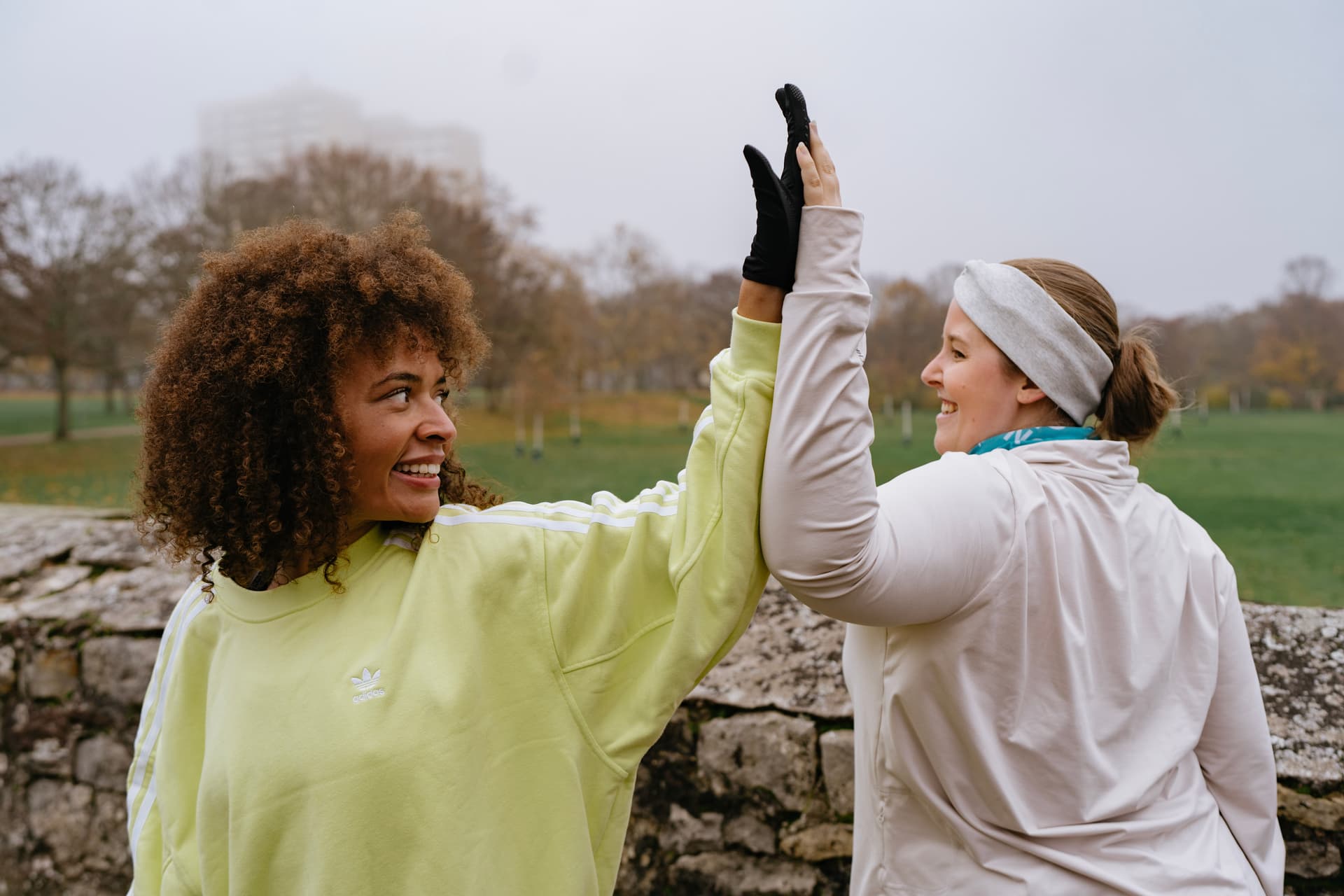 Zwei Personen motivieren sich gegenseitig zwischen zwei Übungen mit einem Highfive