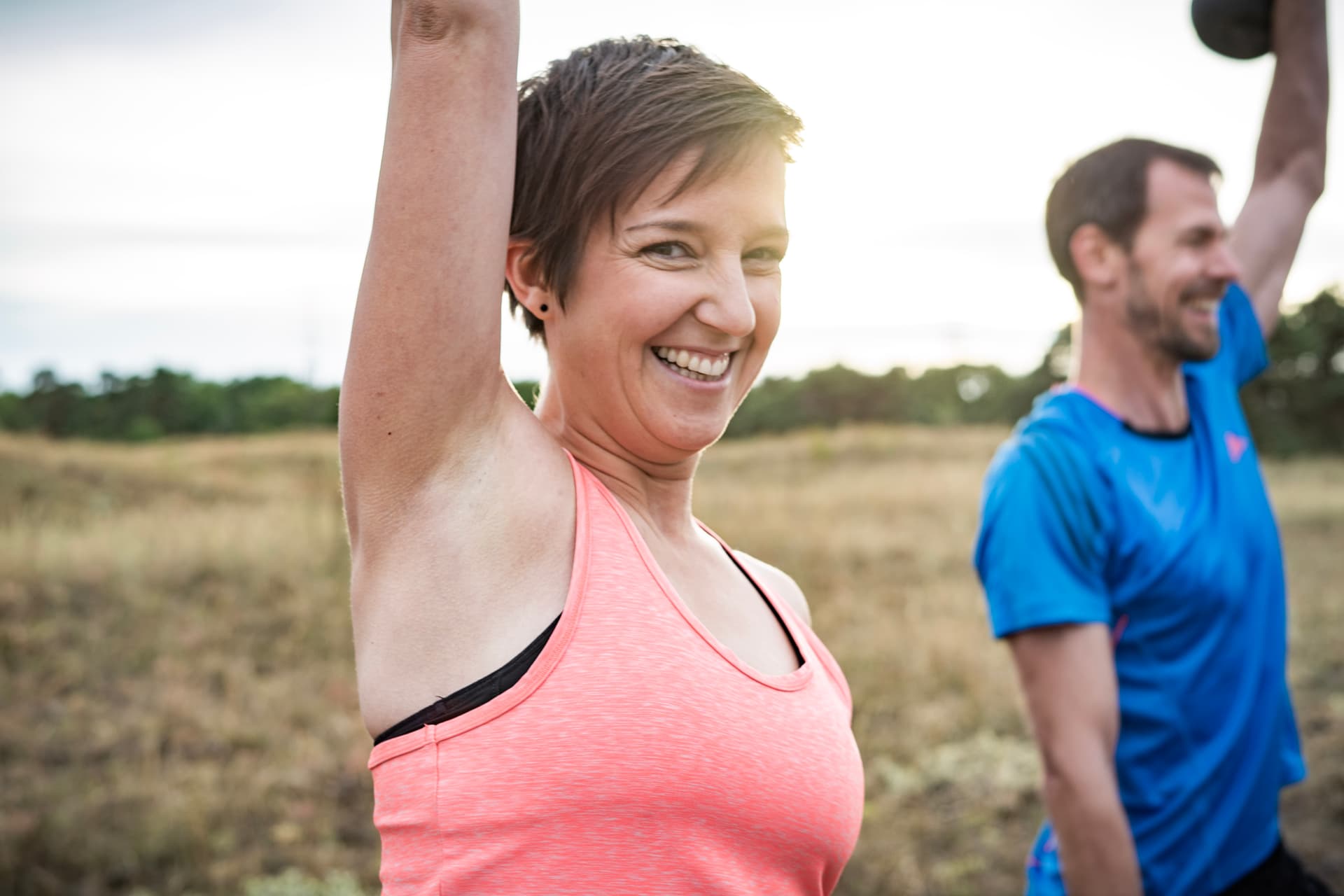 Frau und Trainer mit Spaß am Mobility Training an der frischen Luft